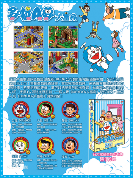 游戏内有6个角色,还有一个是隐藏角色,每个角色都有优点及缺点:哆啦A梦(叮当)配音:林保全