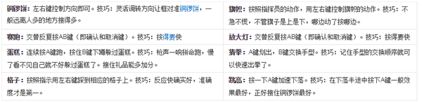 比赛模式:模式中会进行8款不同的游戏;采用计分模式,每个游戏都会计分,玩完8款游戏后,累积分数最多者胜。 练习模式:练习模式中,玩家可自行选择一款游戏练习,比赛比较容易,难度比较低。