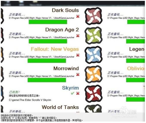 安装nmm时,软件会搜索游戏,这时为了方便,只要搜索到上古卷轴5,就可以关掉其他的搜索,如下图,将skyrim点√,其他直接点×,然后确定安装即可。