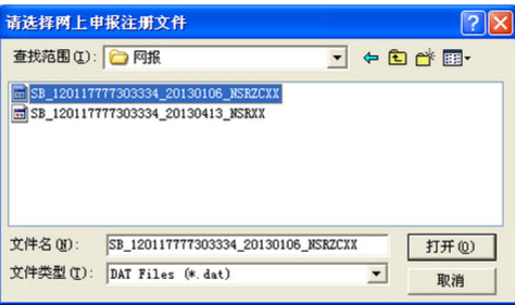 网上申报注册文件是包括企业税号和字母“NSRZCXX”的DAT文件,如SB_120105000000001_20051215_ NSRZCXX.DAT。