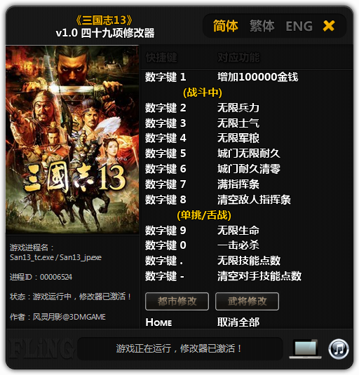 三国志13四十九项修改器是一款功能强大的三国志13修改器,为玩家提供了无限兵力、无限士气、无限军粮、无限金钱等四十九项属性修改功能,丰富而强大的功能可以让你在游戏中所向披靡,开创属于自己的三国霸业。