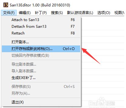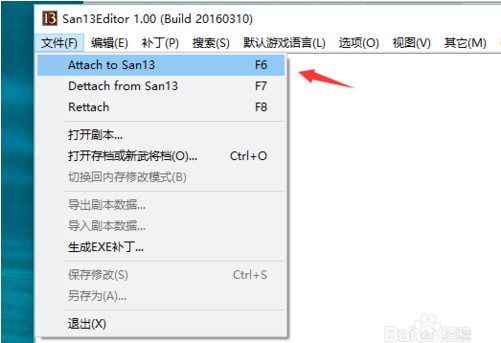 在打开的Van修改器上点击“文件”然后在点击“Attach to san13”进去内存读取当前游戏
