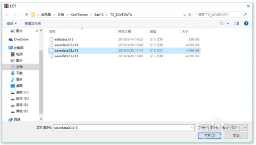 然后,找到存档的位置:文档->KoeiTecmo->San13->TC_SAVEDATA ,找到你想要修改的那个存档,并打开即可