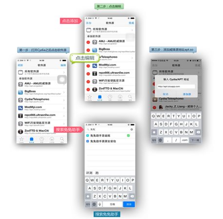 打开设备上的Cydia,找到“管理”-->“软件源”,先点击右上角“编辑”,再点击左上角“添加”,在弹出框内输入相关源地址,点击右上角“完成”,即可成功添加源。(建议添加兔兔官方源:http://apt.tutuapp.com)