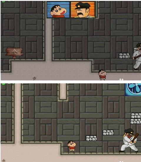 第六关:一家人到达了内部的洞口,淘气的小新跑的太快把其他人甩在了后面,此时桥断了,小新只有一个人去面对公爵及其手下的威胁!