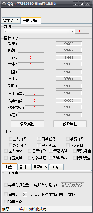 剑雨江湖辅助工具是为《剑雨江湖》游戏玩家们所准备的辅助工具。该工具不仅可以帮助玩家在游戏中快速升级、自动完成各种任务,还可轻松助攻副本,挑战多种难度打怪。