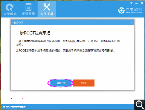 切换到软件“实用工具”页面,找到“一键Root”的按钮,点击后弹出“注意事项”对话框,阅读完毕没有异议就再次点击“一键Root”,软件立即开始获取中兴v880+Root权限!