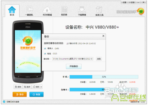 三、备份各人资料,点击如上图备份按钮,选择联系人和信息选项,开始备份,建议将备份资料地址改到自己熟悉的位置。以方便刷机后还原。