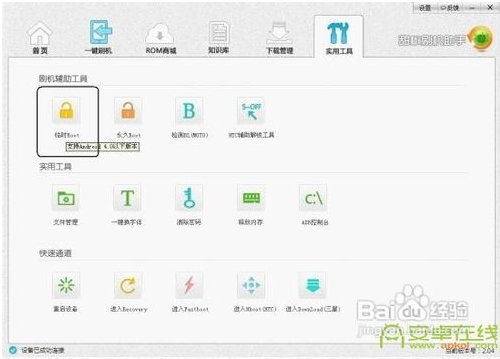 四、下来就需要对手机获取ROOT权限。打开软件实用工具,找到ROOT工具,直接点击即可。我一般选择临时ROOT,一分钟左右,会提示ROOT成功。
