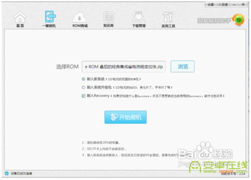 六、选择ROM并下载后,可以进入下载管理查看下载进度。下载完成,可以直接刷机。点击开始刷机,会进入一键刷机界面,如果你知道什么是 Recovery,并不想更换自己的Recovery,就把默认刷入Recovery选项取消。软件默认帮你选择刷入甜椒刷机助手的中文 Recovery。