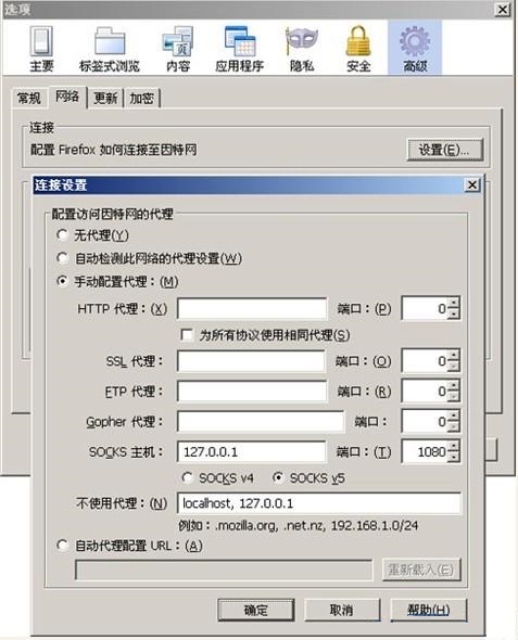 然后,打开FireFox浏览器,选择菜单栏的“工具/选项…”。选择“高级/网络”,点设置,就出现下面的界面,就可以进行代理服务器的设置了,选中“手动配置代理”,然后在SOCKS主机上,填写代理服务器的地址127.0.0.1,端口1080,SOCKS类型选择“SOCKS V5”,这时Firefox就配置结束。