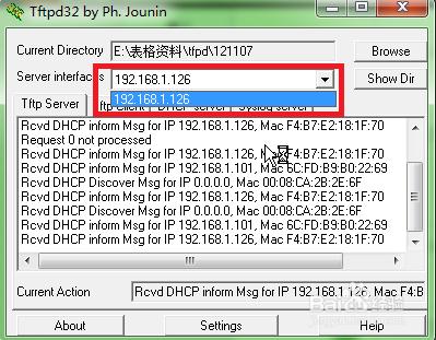 3.双击tftpd32.exe,启动tftp服务器(tftpd32.exe会自动检测到本机ip,此时在server interface右边的下拉菜单里将会出现本机ip,如果本机有多个网络连接,则点击下拉菜单会将会看到它们(不过右边有passive标志),这也是第2步禁用其它ip的主要原因).