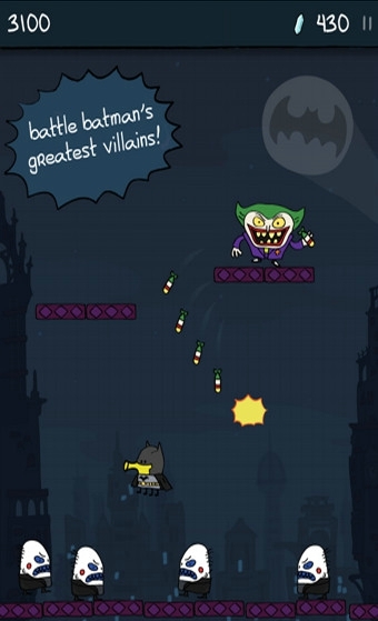 游戏是一款以蝙蝠侠为主题的涂鸦跳跃游戏,游戏中玩家控制涂鸦小怪物不断向上跳跃即可,最后以分数看实力。但是在跳跃过程中还要尽可能多的收集钻石才行,钻石不但能增加分数还能帮助玩家复活哦。还有就是沿途不断出现的拦路的小喽喽,玩家既可通过高超的技术绕过去也可直接点击屏幕进行射击。此外,脚下的跳板并不都是固定的,有些踩一次就会消失或者爆炸,玩家一定要格外小心才行。