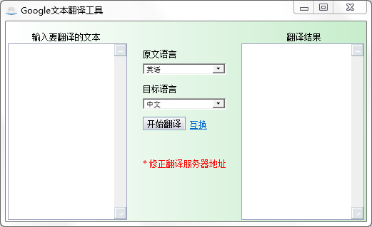 Google文本翻译工具是一款小巧、快速、准确的即时翻译工具,无需安装、体积小、低内存占用、绿色使用。可在几十种语言之间互相转换,是基于Google翻译制作的软件。程序采用Google强劲的在线实时翻译技术,可以让您在全世界40多种语言之间互相翻译。支持的语言有:中文、英语、日语、韩语、法语、德语、俄语、意大利语、葡萄牙语、阿拉伯文、加泰罗尼亚语等42种