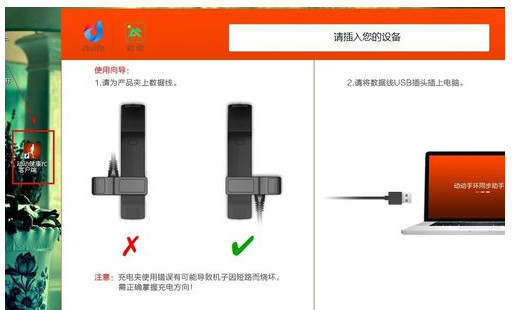 2.然后把手环的数据线连接到手环,连接完成之后,另一端插头连接到电脑端,即可进行手环的绑定。之后就可以通过客户端来查看运动量、睡眠数据等运动数据。