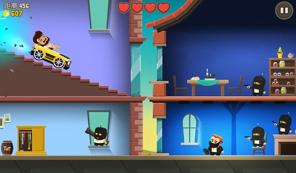 游戏开始,大叔乘着帅气座驾登场,原来是一跑酷游戏啊,随着不断撞击,前进,撞击,接着来到一栋大厦,这才发现别有洞天,居然还融合了大楼冒险的玩法以及攻击的元素。比单一的一种玩法更丰富,让人惊喜连连。