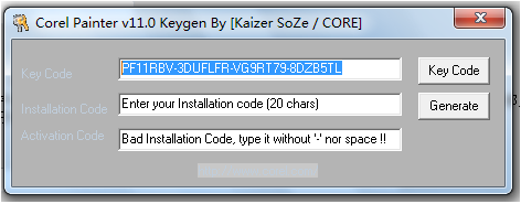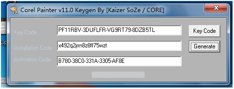 11、这时就要用到我们没关闭的Corel Painter 11注册机了。把全部的安装代码输入到注册机的第二个文本框中,这时点下"Generate"按钮。就会在最下面的文本框中出现激活代码了。