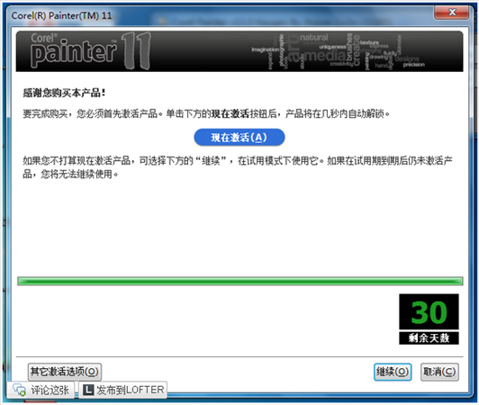 打开Corel Painter 11软件会弹出激活窗口。点“其它激活选项”按钮。