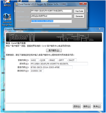 然后装好后软件提醒要激活,在激活的界面选中间那个方式,好像是“致电corel”那个(忘记了……),然后就看到一个20chars的Installation code,复制到注册机第二行,然后再generate一下,把生成的第三行激活码粘贴进去就好了