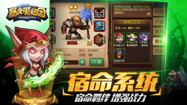 《暴走魔兽团》的英雄们都有着属于自己的传说,当命中的牵绊让我们相遇时,产生联系的英雄们就将迸发出无与伦比的力量。S、A+、A品质的英雄,都有自己的宿命。集齐宿命中的特定英雄,就可以激活宿命系统,获得攻击、生命、物防,魔防四大属性的加成,英雄的战斗力将得到大幅提升,为你的战队再添战力!