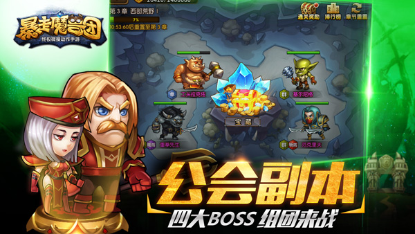 《暴走魔兽团》新版本上线后,超燃的公会副本,必将为你带来一场激情四射的战役。公会将在达到2级时,开启公会副本。同一公会的勇士们可并肩作战,击败公会BOSS,赢取神秘宝藏。每个副本中,玩家们将遭遇到不同特点的BOSS,巧妙的安排上阵英雄,才能成功应对魔防高、物防高等不同的智能BOSS。同时,成员每次攻打BOSS时,都将获得大量的公会贡献,首次击杀BOSS的成员将获得额外的公会贡献奖励,并开启神秘的BOSS宝藏,赢得至高无上的荣耀。