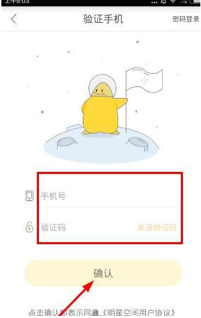 明星空间如何注册1、打开软件,就进入注册界面,输入手机号和验证码点击确认按钮,