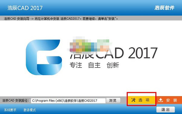 三、选择CAD2017的安装路径,默认路径为C:\Program Files (x86)\浩辰软件\浩辰CAD2017,可点击浏览更换路径,不过建议默认,并点击选项