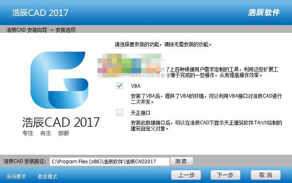 四、选择浩辰CAD2017需要安装的功能,可选择: