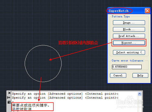 但不幸的是!AUTOCAD很多版本的超级填充偏偏创建不了区域覆盖(WIPEOUT)。点Wipeout按钮后,即使是在简单的矩形或圆形的封闭区域中单击,也会出现错误提示,根本无法生成区域覆盖,如下图所示。