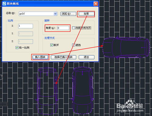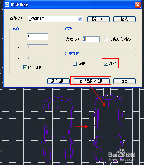 图块断线功能不仅可以处理已插入的图块,还可以通过选择名字、在图中拾取或浏览文件来插入新的图块,在插入图块的同时完成断线或遮挡的处理,并可以设置图块的旋转角度,如下图所示。