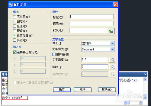 2 、在菜单中选择:绘图>块>定义属性,或者在命令面板中单击:插入>定义属性按钮,或者直接输入命令ATTDEF,调用定义属性的命令,打开“定义属性”对话框,如下图所示。