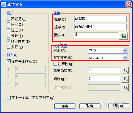 标记就是告诉我们这个属性值是干什么的,比如是宽度、长度、图纸名、审核人,比如这个轴号我么可以写上AXISNO。