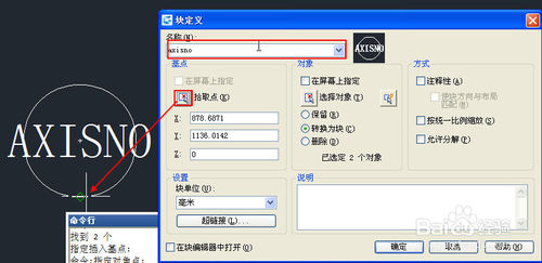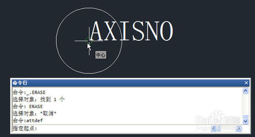 将圆和属性文字一起选中,输入B,回车,打开图块定义对话框,给图块命名为AXISNO,将图块基点指定到圆心或下面的象限点位置,如下图所示。