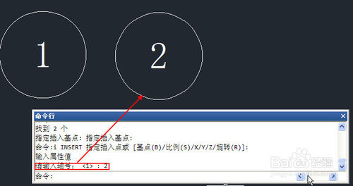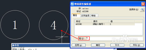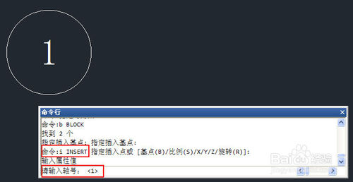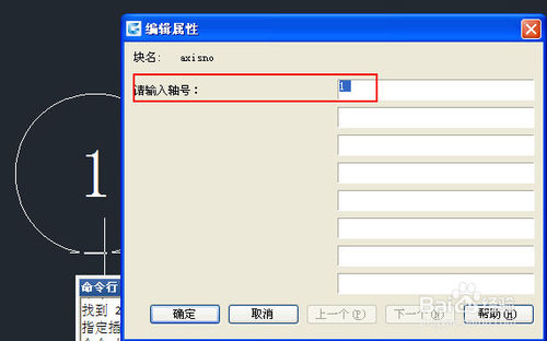 输入I,打开插入图块对话框,在图块列表中选择刚定义的AXISNO,点确定按钮关闭插入对话框,将插入点定位到原图块的右侧,此时可以看到命令行会出现提示和默认值,不再弹出定义图块时的编辑属性对话框了,如下图所示。