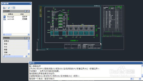 2、输入XCLIP命令,回车,命令会提示选择对象,单击刚刚插入的外部参照,回车,注意看命令行会弹出了一些选项,如下图所示。
