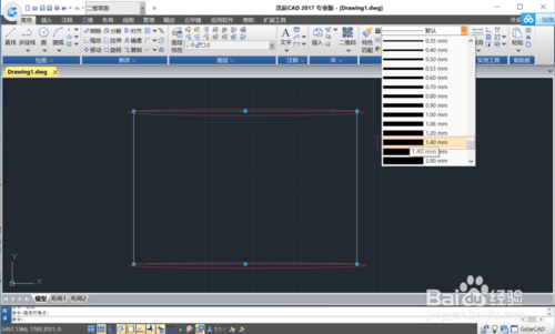 选中上下两条线段之后,下拉默认线宽处,选择线宽1.40mm。(设置线宽也在这里)