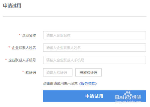 4) 用户输入“企业名称”、“企业联系人姓名”、“企业联系人手机号”、“验证码”后,点击申请试用。
