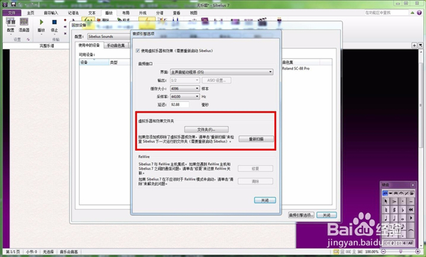 在弹出的音频引擎设置窗口,选择中间虚拟乐器和效果文件夹选项,点击中间的文件夹名称,如图所示: