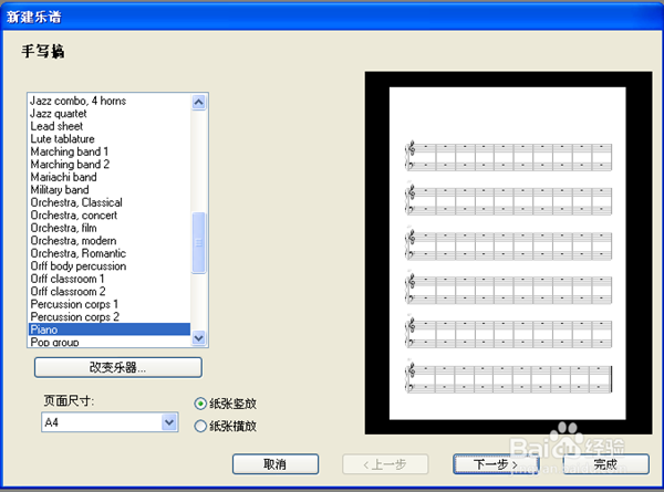 如:需要钢琴谱的就选“Piano”,翻译过来就是“钢琴”,为G谱号+F谱号构成的大谱表。只需要G谱表则选择“Treble staff”,翻译为“高音谱表”;只需要F谱表,选择“Bass staff",译为”低音部乐谱“。软件播放这三种谱时均用钢琴播放。