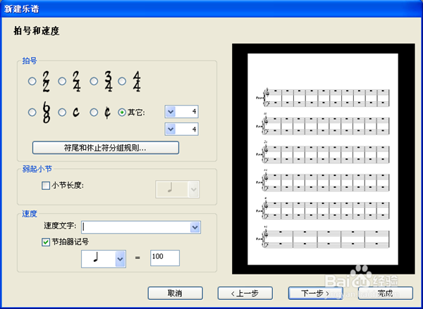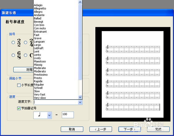 选定好版面,就到了拍号、弱起小节、速度、音乐表情术语的设置了。