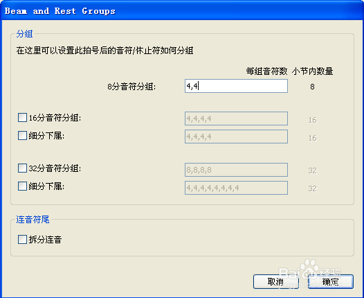 软件有几个常用拍号的选择,直接点选就可以了,如果是另外的拍号,点选“其它”,然后点小三角自行选择。在拍号设置的底下有一个“符尾和休止符分组规则。。。”的东西(如下第二张图),如果没有特殊要求的话,也不需要设置,直接用默认就好。