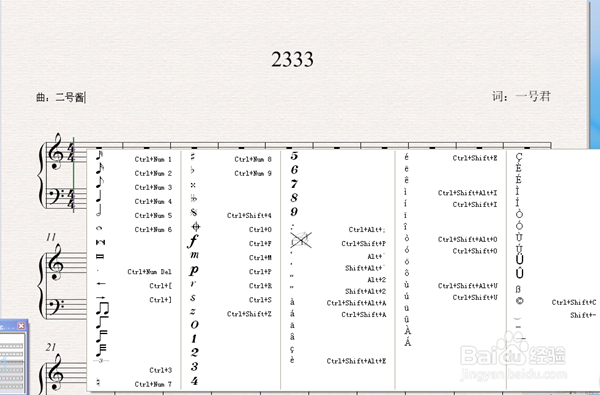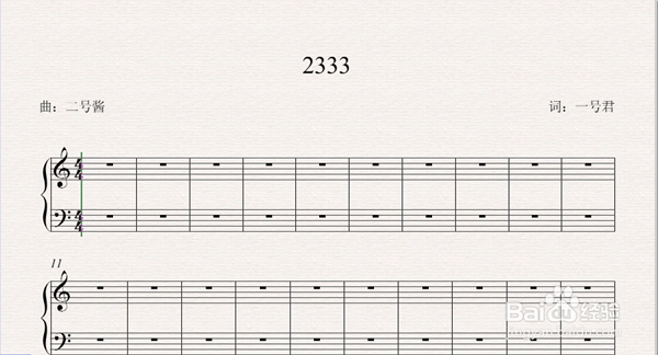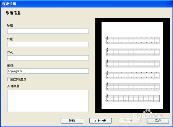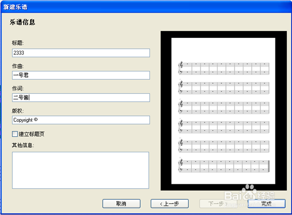 其它没什么好说,就是最后在乐谱上显示时,作词和作曲者的名字会显示在乐谱的左和右上角,一边一个,并且不署上谁是作词,谁是作曲。所以这些在输入时就要自己署上了。