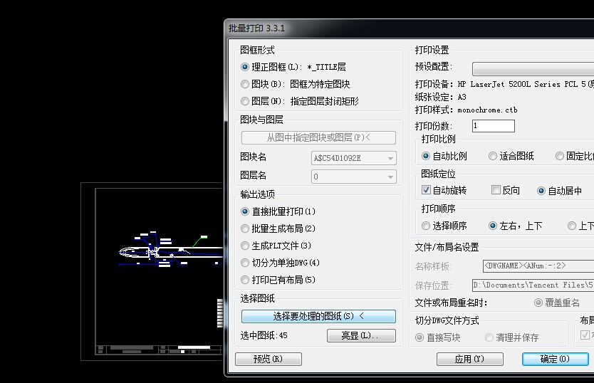 2. 支持智能识别图纸的打印区域(图框)及绘图比例,无需逐个设置图纸的打印区域。