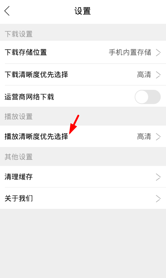 在设置页面里选择“播放清晰度优先选择”选项,进行默认清晰度的调节。