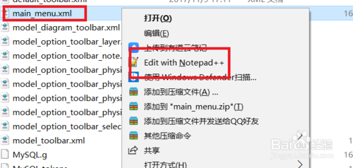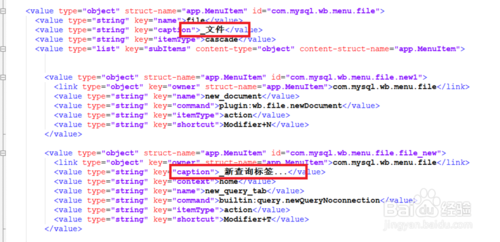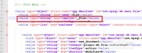 我们用notepad++这个软件打开main_menu.xml文件。在里面可以找到很多的菜单标识。如下图所示,可以看到File,对应的有一个key=caption。
