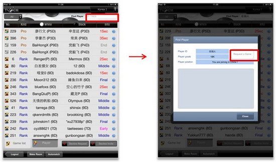 (2)从用户列表申请:先切换到用户列表,点击对应的蓝色箭头按钮,点击“RequestaGame”发送对局申请