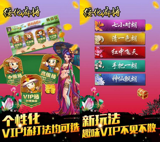 绥化麻将起源于东北绥化地区的地方性麻将,除了一般的番型外,还增加天胡、地胡、清一色、七小对、飘胡、红中满天飞、手把一等新鲜玩法。富有别致趣味性,绥化麻将完美诠释本地打法,人气火爆,免费下载,安装后即可开始游戏,每天登录都享有免费金币拿,感受线下最真实地麻将。