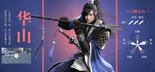 华山在游戏中的定位是近战DPS,出色的群攻、强悍的控制,灵活多变的剑势令他穿梭于攻守之间,在团队作战中起着不可或缺的辅助作用。