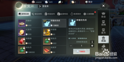 玩家通过界面上方的“珍宝阁”图标,可找到商会或商城的界面。大家进入到这些商城界面里,可根据物品分类,选购各种游戏道具,诸如宝石、装备打造材料、古董材料、家园材料、时装挂件、坐骑特效等。商会里的物品购买消耗铜币,而商城里的道具购买,需要消耗元宝或银两。此外,玩家还可以将自己不需要的物品,出售给商会换取一些铜钱奖励