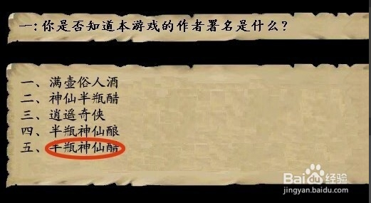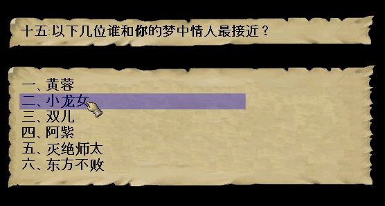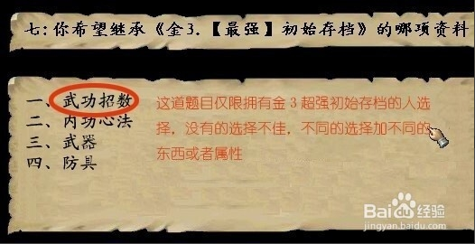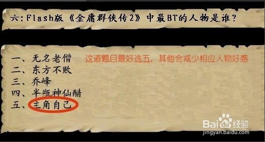 1.【半瓶神仙醋】。2.【不知道】或【当然保留着】。3.随便回答。4.【极端的工作狂人】。5.随便回答。6.选5。7.【防具】。8.【武林世家】。9.【剑术】。10.【悟性】。11.【资质俱佳】。12【心思庞杂】13.【心有贪念】。14.【钱要省着花】15.增加所选角色的好感度+20。 16.【富可敌国的财富】。